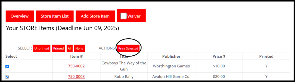 - Check off the items you would like to print tags for – you can use the SELECT buttons to select the ones you have not printed yet (or several other available options).